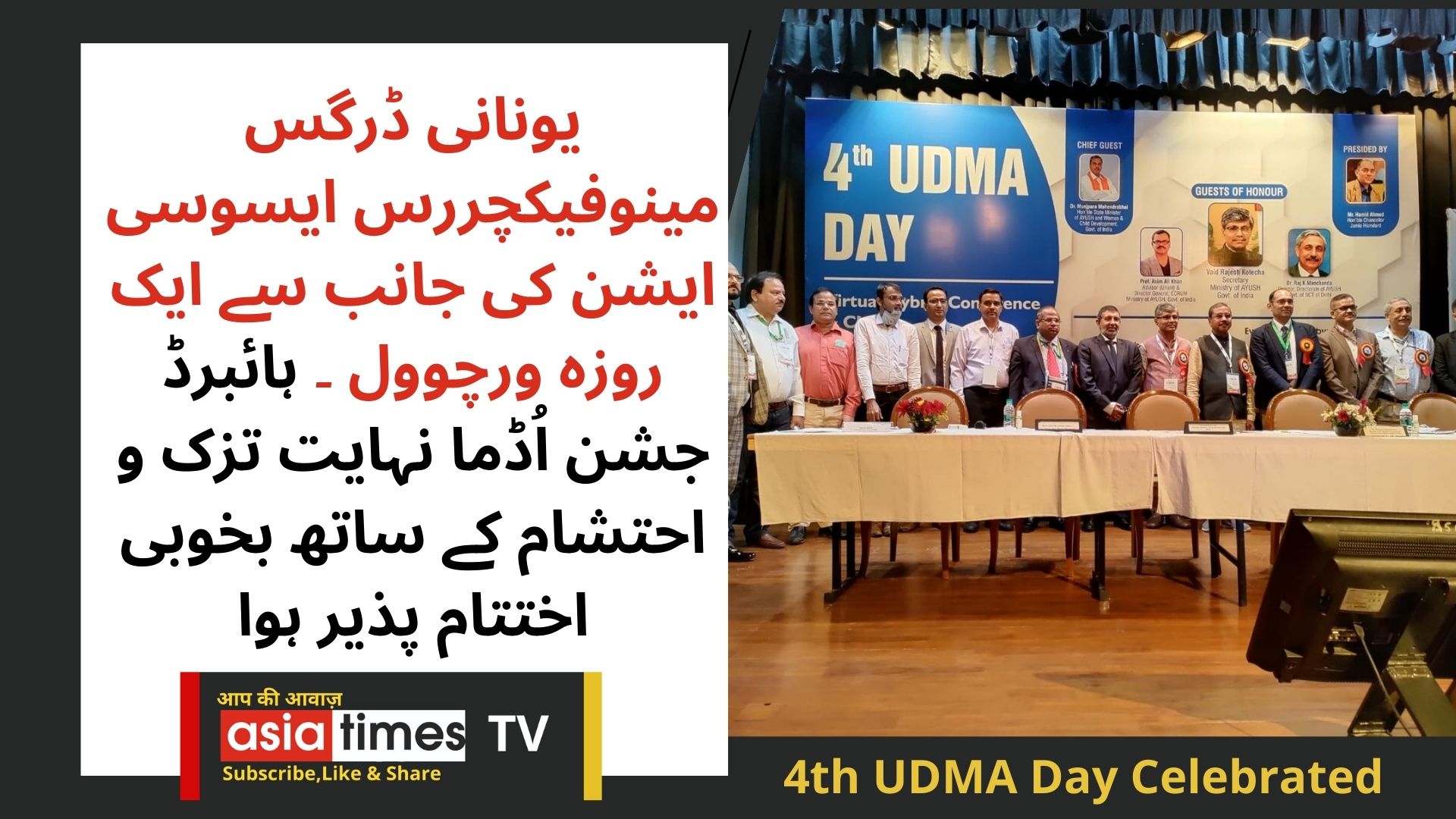 جناب مقبول حسن (نائب صدر، اُڈما)، جناب محمّد عارف (پیٹرون، اُڈما)، جناب پرویز احمد خاں (ممبر۔گورننگ باڈی، اُڈما و نائب چیئر مین۔ جشن یوم اُڈما)، جناب سیّد منیر عظمت (ممبر گورننگ باڈی، اُڈما و آرگنائزگ سکریٹری یومِ اُڈما)، جناب محمّد جلیس (ممبر گورننگ باڈی، کورڈینیٹر ـ ای. سووینئر)، جناب حکیم یثمانیل عثمانی (ممبر۔ اُڈما) نے بالترتیب مہمان خصوصی اور مہمانان ذی وقار نیز صدر محترم کو شجر/ بونسائی پلانٹ پیش کرکے عزّت افزائی کی۔جناب سیّد منیر عظمت نے اپنے تحسین آمیز کلمات پر مبنی خطبہ استقبالیہ میں مہمانان کا فرداً فرداً استقبال کرتے ہوئے اپنی نیک خواہشات کا اظہار کیا۔ انہوں نے مزید فرمایا کہ ہمارے چاروں معزز و قابل احترام مہمانان کشادہ قلب اور متحرک شخصیت کے حامل ہیں اور طب یونانی کے بہی خواہان کی حیثیت سے ہمارے معاون اور سرپرست ہیں نیز یونانی پیتھی کی بقا اور ترقی کے لیے اپنے دل میں نیک جذبہ رکھتے ہیں۔ بعد ازاں وزیر محترم، مہمانان ذی وقار اور اُڈما کے عہدیداران کے ہاتھوں ای۔ سوینئر مع ای۔ آیوش میلہ کا رسمِ اجراء عمل میں آیا۔ جناب پروفیسر عاصم علی خاں کا خصوصی خطاب ہوا۔ اس کے بعد جناب ڈاکٹر راج۔ کے۔ منچندا، جناب پروفیسر آبشار عالم (وائس چانسلر، جامعہ ہمدرد) اور جناب وید راجیش کوٹیچا کے بیانات ہوئے۔بعد ازاں آل اندیا بی۔ یو۔ ایم۔ایس ٹاپرس کا اعلان کیا گیا اور سوئم، دوئم اور اوّل انعام یافتگان ڈاکٹر طوبٰی بلال وانی، ڈاکٹر مہوش ایّوب اور ڈاکٹر بشرٰی حسین کو ان کے والدین کی موجودگی میں بالترتیب 25,000، 35,000 اور 50,000 رقم مع میڈل عزّت مآب مرکزی وزیر مملکت وزارت آیوش و محکمہ برائے بہبود خواتین و اطفال، حکومت ہند کے ہاتھوں دیا گیا۔ ساتھ ہی وزیر موصوف نے خطاب فرمایا۔مہمان خصوصی، مہمانان ذی وقار، صدر اُڈما، مرکزی و صوبائی حکّام، اُڈما کے معاونین کو بطور عزّت افزائی شال اور مومینٹو پیش کئے گئے۔
