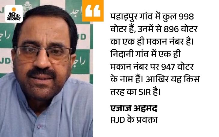 RJD प्रवक्ता बोले- एक घर में सैकड़ों वोटर, फिर कैसा SIR हुआ RJD के प्रवक्ता एजाज अहमद कहते हैं, ‘निदानी और पहाड़पुर गांव का मामला चुनावी प्रक्रिया पर गंभीर सवाल है। तेजस्वी यादव पहले से चेतावनी देते रहे हैं कि SIR के नाम पर गड़बड़ियां की जा रही हैं। सरकार में शामिल नेताओं के दो-दो एपिक नंबर और अलग-अलग जगह वोटर लिस्ट में नाम होना, इस बड़े खेल का सबूत है। BJP, JDU और NDA को फायदा पहुंचाने के लिए SIR किया गया है।’