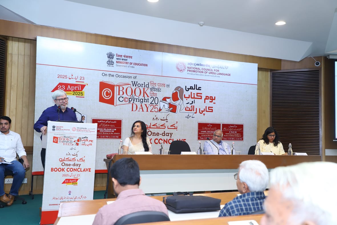 नई दिल्ली: राष्ट्रीय उर्दू भाषा विकास परिषद,नई दिल्ली के तत्वावधान में 23 अप्रैल, 2025 को विश्व पुस्तक एवं कॉपीराइट दिवस के अवसर पर एक दिवसीय पुस्तक कॉनक्लेव का आयोजन किया गया, जिसके अंतर्गत तीन सत्र आयोजित किए गए। पहले सत्र का शीर्षक था ‘आर्टिफिशियल इंटेलिजेंस के युग में कॉपीराइट की चुनौतियां’ इसकी अध्यक्षता जामिया हमदर्द के कुलपति प्रोफेसर मुहम्मद अफशार आलम ने की। राष्ट्रीय उर्दू भाषा विकास परिषद नई दिल्ली के निदेशक डॉ. शम्स इक़बाल ने परिचयात्मक एवं स्वागत भाषण देते हुए कहा कि एक पुस्तक पाठक, लेखक और प्रकाशक की त्रिमूर्ति से बनती है। किसी पुस्तक से बौद्धिक विमर्श स्थापित किया जा सकता है।