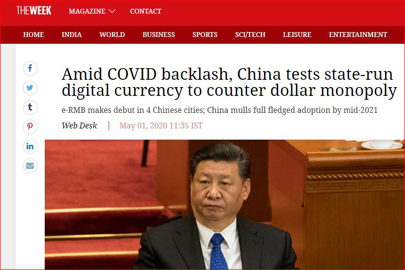 दिल्ली : ( एशिया टाइम्स ) डॉलर के अच्छे दिन गए, डॉलर की दादागिरी खत्म हुई, कोरोनावायरस (COVID-19) महामारी और वैश्विक वित्तीय संकट के बीच चीन ने विश्व की पहली आधिकारिक डिजिटल मुद्रा लॉन्च कर दी. इसे E RMB का नाम दिया गया है और चार मुख्य शहरों में पायलेट प्रोजेक्ट के बाद शीघ्र ही इसे डॉलर सेटलमेंट के लिए स्वीकार किया जाएगा।