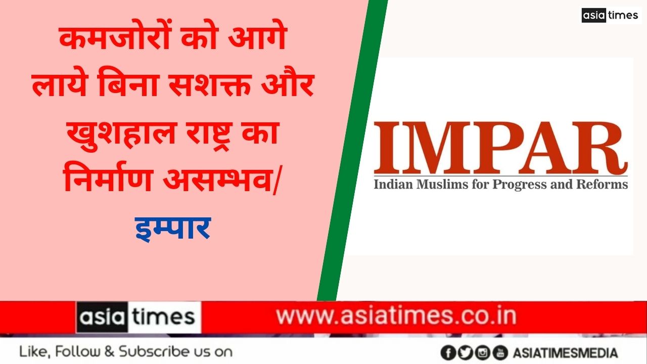 बड़े पैमाने पर आबादी वाले मुस्लिम छेत्रों में मुस्लिम उम्मीदवारों के लिए उचित प्रतिनिधित्व सुनिश्चित करने पर बल दिया है. इम्पार ने अपनी रिलीज में आगे कहा है कि इम्पार को उम्मीद आशा है कि राजनीतिक दल अपने कार्य एजेंडे में उपरोक्त बिंदुओं को शामिल करेंगे और नई सरकार बनने के बाद उन्हें निश्चित तौर पर लागू करेंगे. इम्पार ने कहा है कि जब तक समाज के कमजोर शोषित पीड़ित वंचित और दबे कुचले लोगों को आगे नहीं लाया जाएगा तब तक एक सशक्त और खुशहाल राष्ट्र बनाने का सपना साकार नहीं हो सकता है.