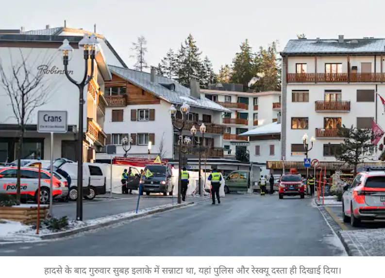 स्विट्जरलैंड के क्रांस मोंटाना शहर के 'अल्पाइन स्की रिसॉर्ट' में गुरुवार को न्यू ईयर सेलिब्रेशन के दौरान विस्फोट हुआ। स्विट्जरलैंड पुलिस के मुताबिक हादसे में करीब 40 लोगों की मौत हुई है, जबकि 115 घायल हैं। मरने वालों में कई देशों के नागरिक शामिल हैं।