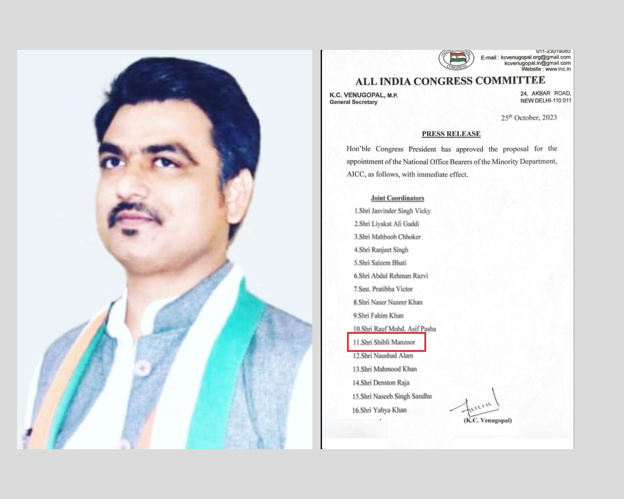 कांग्रेस अध्यक्ष श्री मल्लिकार्जुन खरगे के अनुमोदन उपरांत अखिल भारतीय कांग्रेस कमिटी अल्पसंख्यक विभाग की राष्ट्रीय पदाधिकारियों की सूची जारी की गई है, जिसमें शिबली मंजूर को राष्ट्रीय ज्वाइंट कोऑर्डिनेटर की जिम्मेदारी सौंपी गई है।