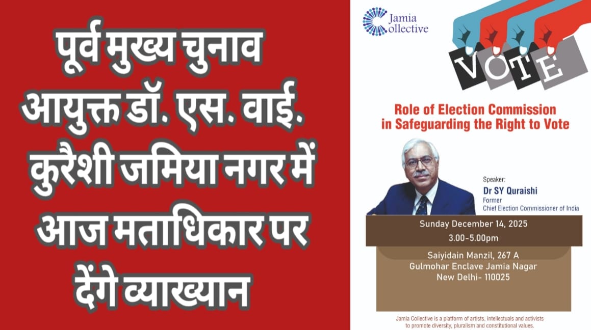 नई दिल्ली:( एशिया टाइम्स न्यूज डेस्क) जामिया कलेक्टिव की ओर से “मताधिकार की रक्षा में चुनाव आयोग की भूमिका” विषय पर एक सार्वजनिक व्याख्यान का आयोजन आज जामिया नगर, नई दिल्ली में किया जाएगा। इस कार्यक्रम में भारत के पूर्व मुख्य चुनाव आयुक्त डॉ. एस. वाई. कुरैशी मुख्य वक्ता होंगे।