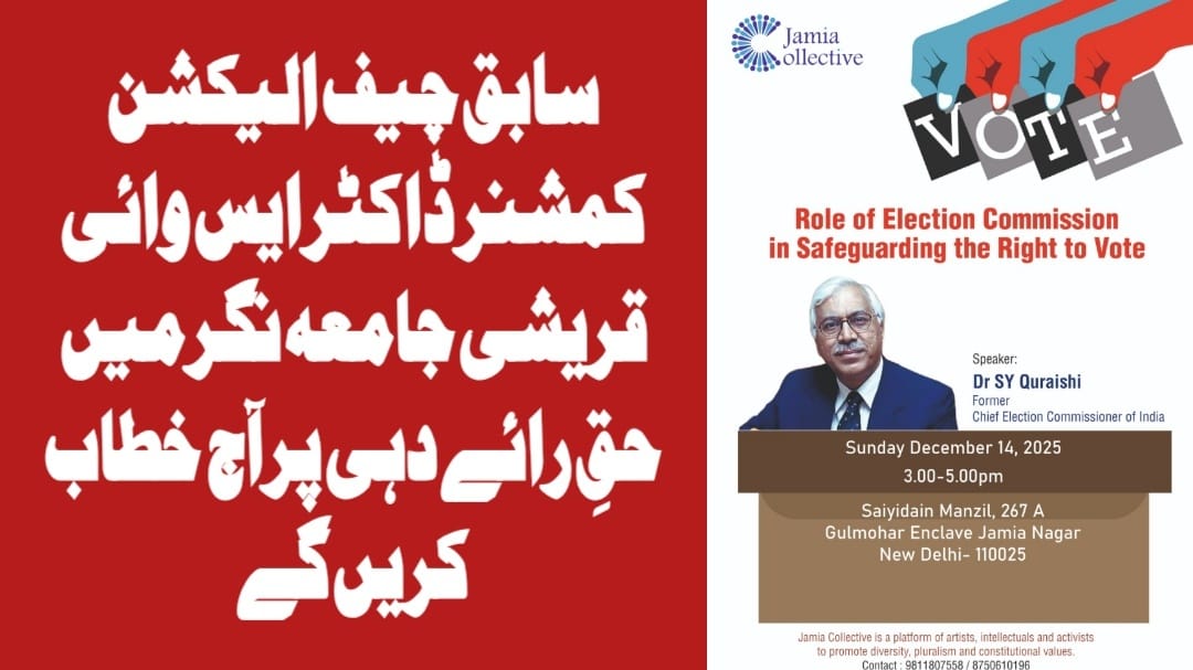 نئی دہلی: (ایشیا ٹائمز نیوز ڈیسک ) جامعہ کلیکٹو کے زیرِ اہتمام “حقِ رائے دہی کے تحفظ میں الیکشن کمیشن کا کردار” کے موضوع پر ایک عوامی لیکچر آج کو جامعہ نگر میں منعقد کیا جائے گا۔