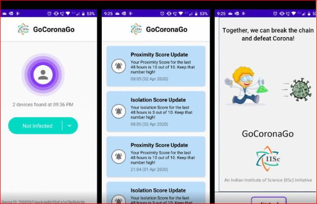 गो कोरोना गो ऐप को आईआईएससी ने डेवलप किया है, जो पता लगाता है कि कहीं यूजर ने कोरोना संक्रमितों या संदिग्धों के साथ यात्रा या रास्ता पार तो नहीं किया। ऐप इस काम के लिए स्मार्टफोन के जीपीएस और ब्लूटूथ के अलावा नेमपिछली कन्वर्सेशन को इस्तेमाल करता है। आईआईएससी के फैकल्टी मेंबर तारुण रंभा ने बताया कि ऐप दूर के संपर्कों के लिए संक्रमित होने की संभावना को समझने के लिए बैकएंड में टेम्परेरी नेटवर्क एनालिटिक्स का इस्तेमाल करता है। इससे यह बीमारी फैलने और सबसे ज्यादा जोखिम वाले लोगों की पहचान करता है। उन्होंने आगे बताया कि ऐप आईसोलेशन और प्रॉक्जिमिटी स्कोर अलर्ट देता है साथ ही सोशल डिस्टेंसिंग बढ़ने में भी मदद करता है। इसमें जियो-फेसिंग फीचर भी है जो खासतौर से उन लोगों के लिए जो खुद को क्वारैंटाइन किए हुए हैं। इसके अलावा ये उन लक्षणों के बारे में भी बताता है जिससे संक्रमित होने की संभावना हो सकती है।