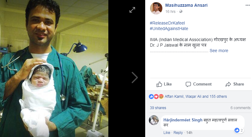 मुझे आशा है कि आप को ये ज्ञात होगा कि Dr. Kafeel Khan जो कि शहर के मशहूर बाल रोग विशेषज्ञ व IMA गोरखपुर के मेंबर हैं, पिछले 6 महीने से भी ज़्यादा समय से जेल में बंद हैं। उनपर बी॰आर॰डी॰ मेडिकल कॉलेज में हुई बच्चों की मौत का प्रत्यक्ष या अप्रत्यक्ष रूप से ज़िम्मेदार होने का आरोप है।