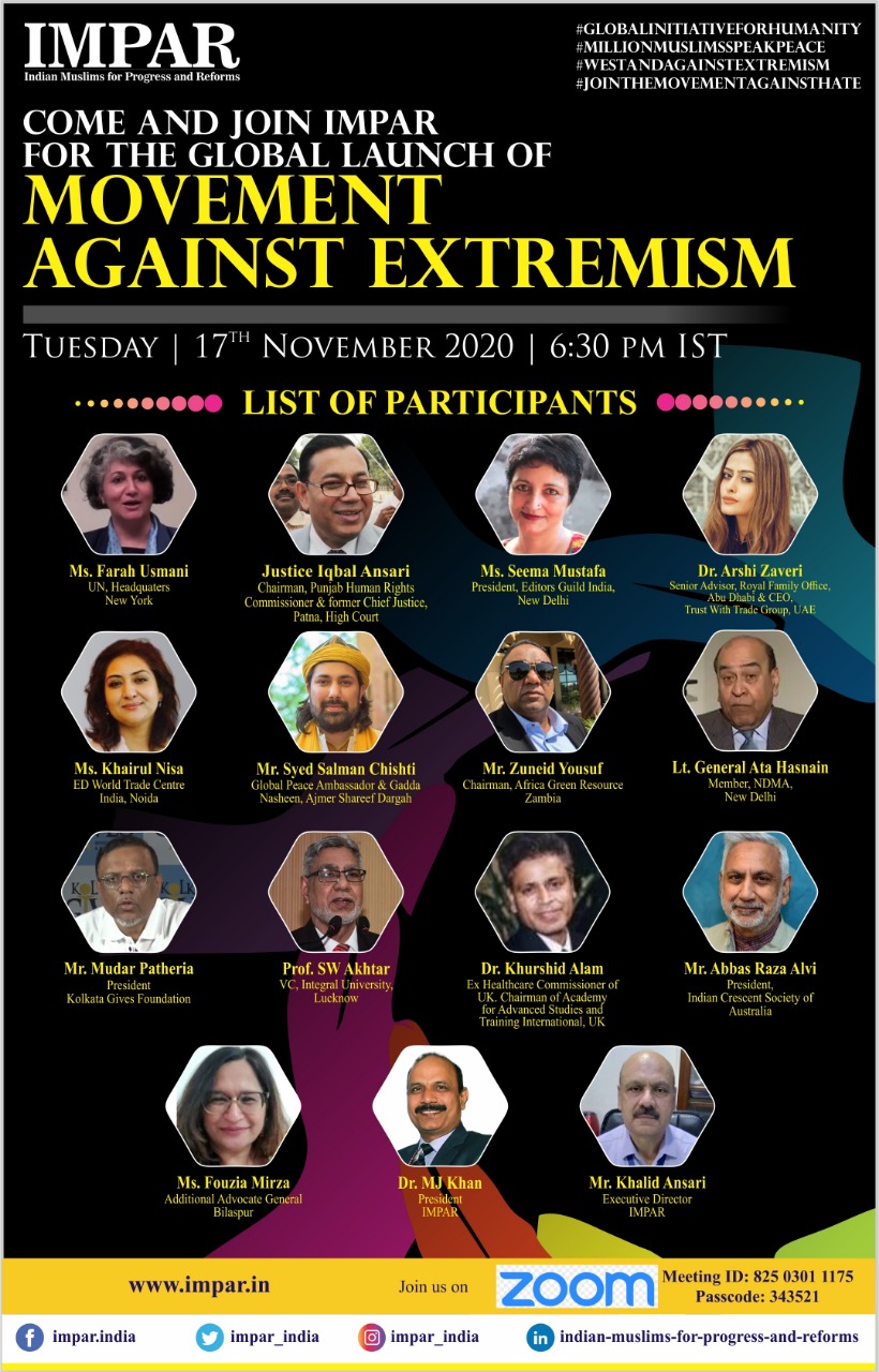 विशाल सामाजिक विविधता और बहुसंस्कृतिवाद के साथसाथ दिलों को जोड़ने वाले सूफी संदेशों के जरिए से भारतीय मुसलमान बहु सांस्कृतिक समाजों में शांतिपूर्ण सह-अस्तित्व के लिए दुनिया को रास्ता दिखाने के लिए सबसे अनुकूल हैं. इम्पार के अध्यक्ष डॉ. एम जे खान ने कहा है कि वह एक मिलियन हस्ताक्षर एकत्र करने और संयुक्त राष्ट्र में जमा करने के लिए आज से "चरमपंथ (अतिवाद) के खिलाफ वैश्विक आंदोलन" शुरू कर रहे हैं. इम्पार ने कहा है कि वह सभी समान विचारधारा वाले लोगों को शांति, न्याय और मानवता के लिए सभी सोशल मीडिया प्लेटफॉर्म के माध्यम से इस आंदोलन में शामिल होने और समर्थन करने का आह्वान करती है।