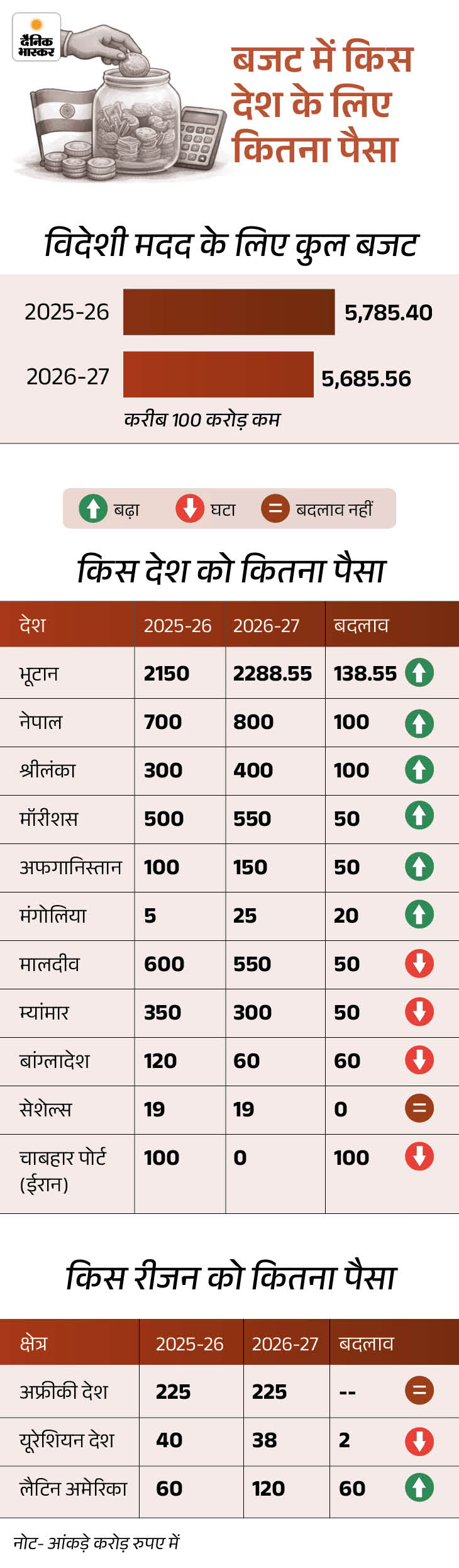 इसके अलावा भारत दूसरे देशों को आर्थिक मदद भी देता है। इसके लिए 2026–27 के बजट में 5,685.56 करोड़ रुपए रखे गए हैं। यह रकम पिछले साल से लगभग 100 करोड़ रुपए कम है। पिछले साल यानी 2025–26 में इस मद के लिए 5,785.40 करोड़ रुपए रखे गए थे।