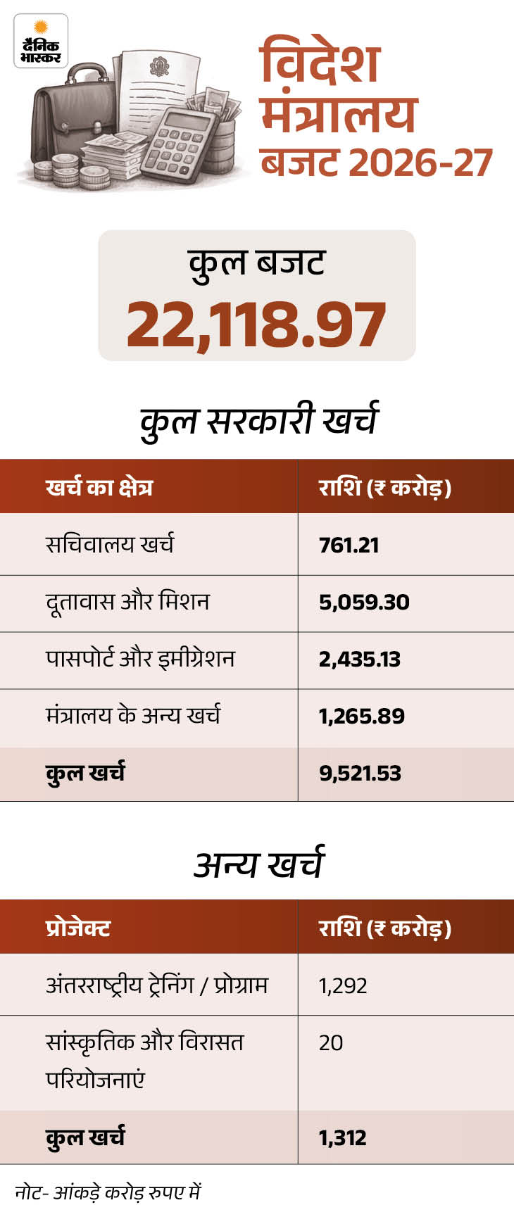 भारत सरकार ने 2026–27 के लिए विदेश मंत्रालय का कुल बजट करीब 22,118 करोड़ रुपए रखा है। इसमें दफ्तर चलाने का खर्च और दूसरे जरूरी कामों का पैसा दोनों शामिल हैं। यह रकम पिछले साल के मुकाबले थोड़ी ज्यादा है।