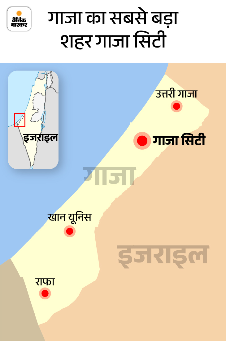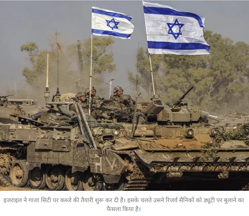 इजराइल ने गाजा सिटी पर कब्जे के लिए 1.30 लाख सैनिकों को मोर्चे पर तैनात करने का फैसला किया है। सैनिकों को ड्यूटी जॉइन करने से कम से कम 2 हफ्ते पहले नोटिस दिया जाएगा।