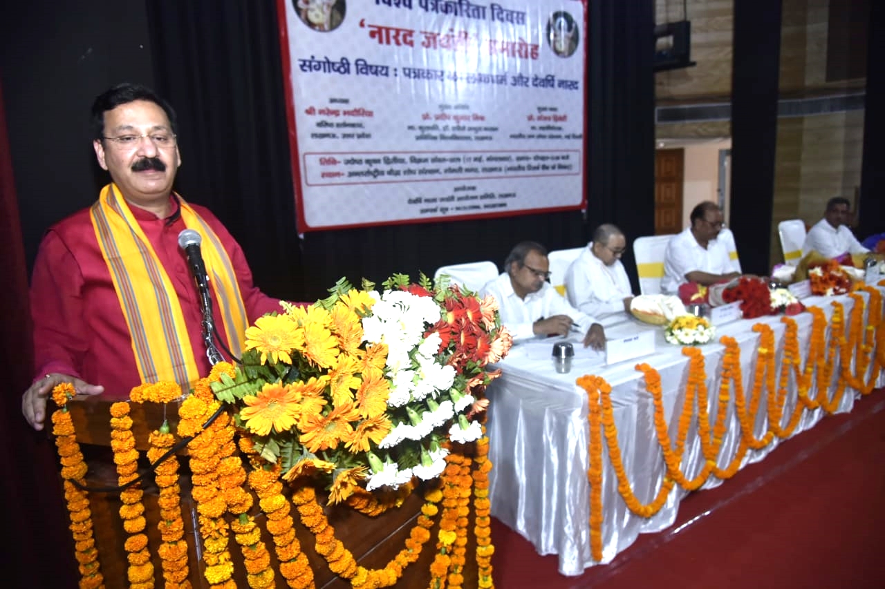 कार्यक्रम की अध्यक्षता करते हुए वरिष्ठ पत्रकार एवं स्तंभकार श्री नरेंद्र भदौरिया ने कहा कि नारद जी पत्रकार ही नहीं, बल्कि वेदों के प्रसारक भी थे। वैदिक वांग्मय से ही भारतीय संस्कृति समृद्ध हुई है। उन्होंने कहा कि जिन लोगों ने हमारे इतिहास को कलंकित किया है, उन्हें इतिहास से बाहर करना होगा।