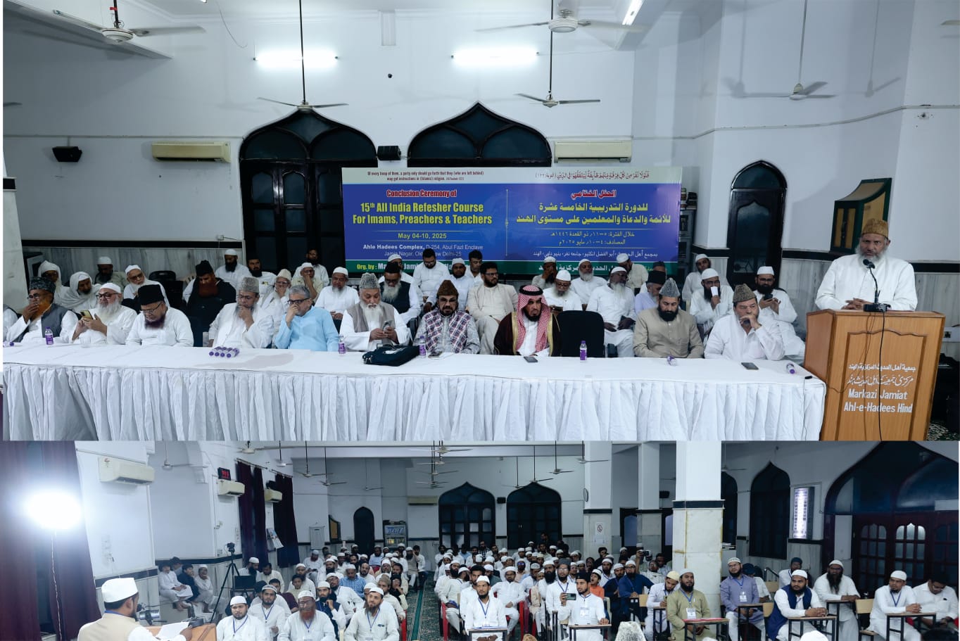 دہلی: ائمہ، دعاۃ و معلمین ملک و معاشرہ کے سب سے بڑے محسن ہیں، ان کے زیر تربیت ملک و قوم اور ملت کا مستقبل پروان چڑھتا ہے اور وہ اپنے دم قدم سے امن و شانتی اور فرقہ وارانہ ہم اہنگی کے قیام، حب الوطنی ،اتحاد و یکجہتی اور جذبہ انسانیت کے فروغ، تعلیم یافتہ اور صالح معاشرہ کی تعمیر، خوف ودہشت سے پاک ماحول کی تشکیل اور ایمانی و ربانی نسل کی آبیاری میں کلیدی کردار ادا کرتے ہیں، مگر شرط یہ ہے کہ ان ائمہ دعا و معلمین کی صحیح خطوط پر ٹریننگ اور تدریب کی جائے اور ان کو اس کے لیے مناسب مواقع، وسائل اور ماحول فراہم کرائے جائیں۔ مرکزی جمیعت اہل حدیث ہند تقریبا 20 سالوں سے یہ اہم ذمہ داری بڑی پابندی کے ساتھ ادا کر رہی ہے۔ ان خیالات کا اظہار مرکزی جمعیت اہل حدیث ہند کے امیر محترم مولانا اصغر علی امام مہدی سلفی نے کیا۔ موصوف مورخہ 10 /مئی 2025 ئ کو بعد نماز مغرب، اہل حدیث کمپلیکس، ابوالفضل انکلیو، جامعہ نگر، نئی دہلی میں منعقد مرکزی جمعیت اہل حدیث ہند کے زیر اہتمام سات روزہ پندرہواں آل انڈیا ریفریشر کورس برائے ائمہ، دعاۃ و معلمین کے باوقار وپُررونق اختتامی اجلاس میں شرکائے دورہ تدریبیہ، اراکین مجلس عاملہ، ذمہ داران ملی تنظیمات اور عوام و خواص کے بری تعداد سے صدارتی خطاب فرما رہے تھے۔