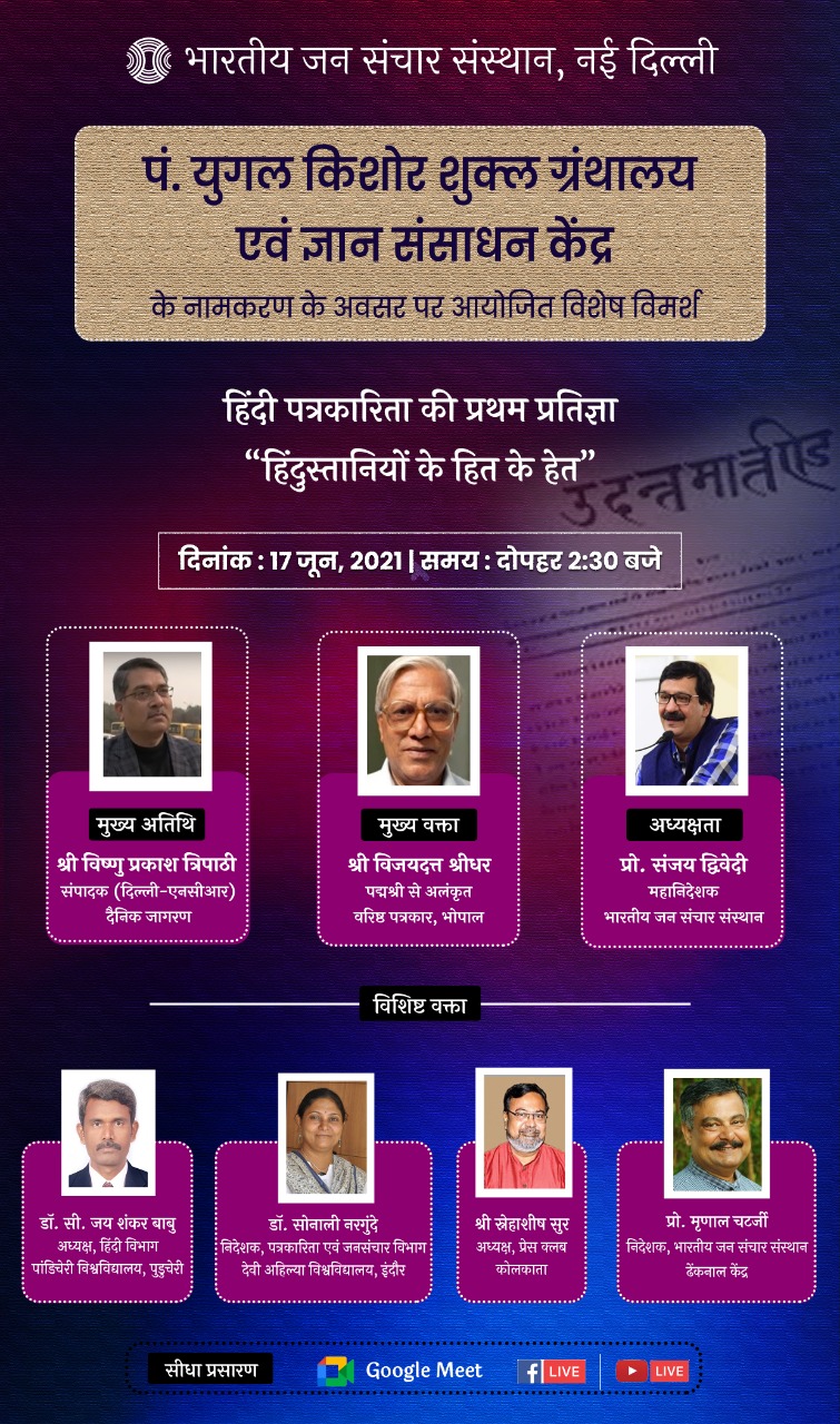प्रो. द्विवेदी ने कहा कि ये हमारे लिए बड़े गर्व का विषय है कि आईआईएमसी का पुस्तकालय अब पं. युगल किशोर शुक्ल के नाम से जाना जाएगा। उन्होंने कहा कि हिंदी पत्रकारिता ने स्वाधीनता से लेकर आम आदमी के अधिकारों तक की लड़ाई लड़ी है। समय के साथ पत्रकारिता के मायने और उद्देश्य चाहे बदलते रहे हों, लेकिन हिंदी पत्रकारिता पर देश के लोगों का विश्वास आज भी है।