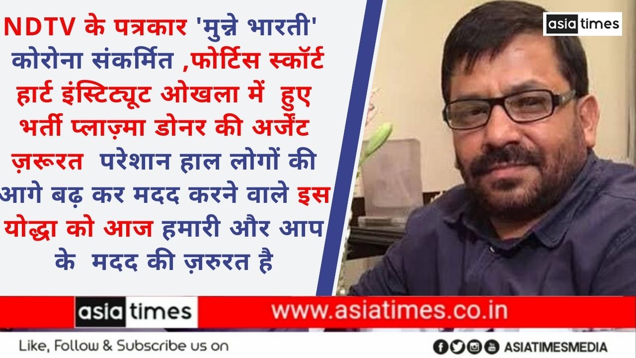 नई दिल्ली : (एशिया टाइम्स /अशरफ बस्तवी ) आप सभी को सूचित किया जाता है की NDTV के पत्रकार ,अग्रणी समाज सेवी M. Atharuddin Munne Bharti इन दिनों सख्त बीमार हैं , उनका कोरोना टेस्ट पॉजिटिव आया है फोर्टिस स्कॉर्ट हार्ट इंस्टिट्यूट ओखला में भर्ती हैं ,उन्हें आज अर्जेंट Plazma Donor की आवश्यकता है। एशिया टाइम्स आप से अपील करता है कि कृपया उनकी जान बचाने के लिए आएं.