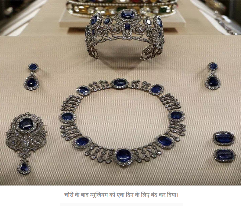 चोरी हुए गहनों में 1855 में बना ऐतिहासिक यूजनी क्राउन भी शामिल है, जो हजारों कीमती रत्नों से जड़ा है। इस ताज के कुछ हिस्से टूटे हुए पाए गए। माना जा रहा है चोरी के दौरान ये टूट गया होगा।
