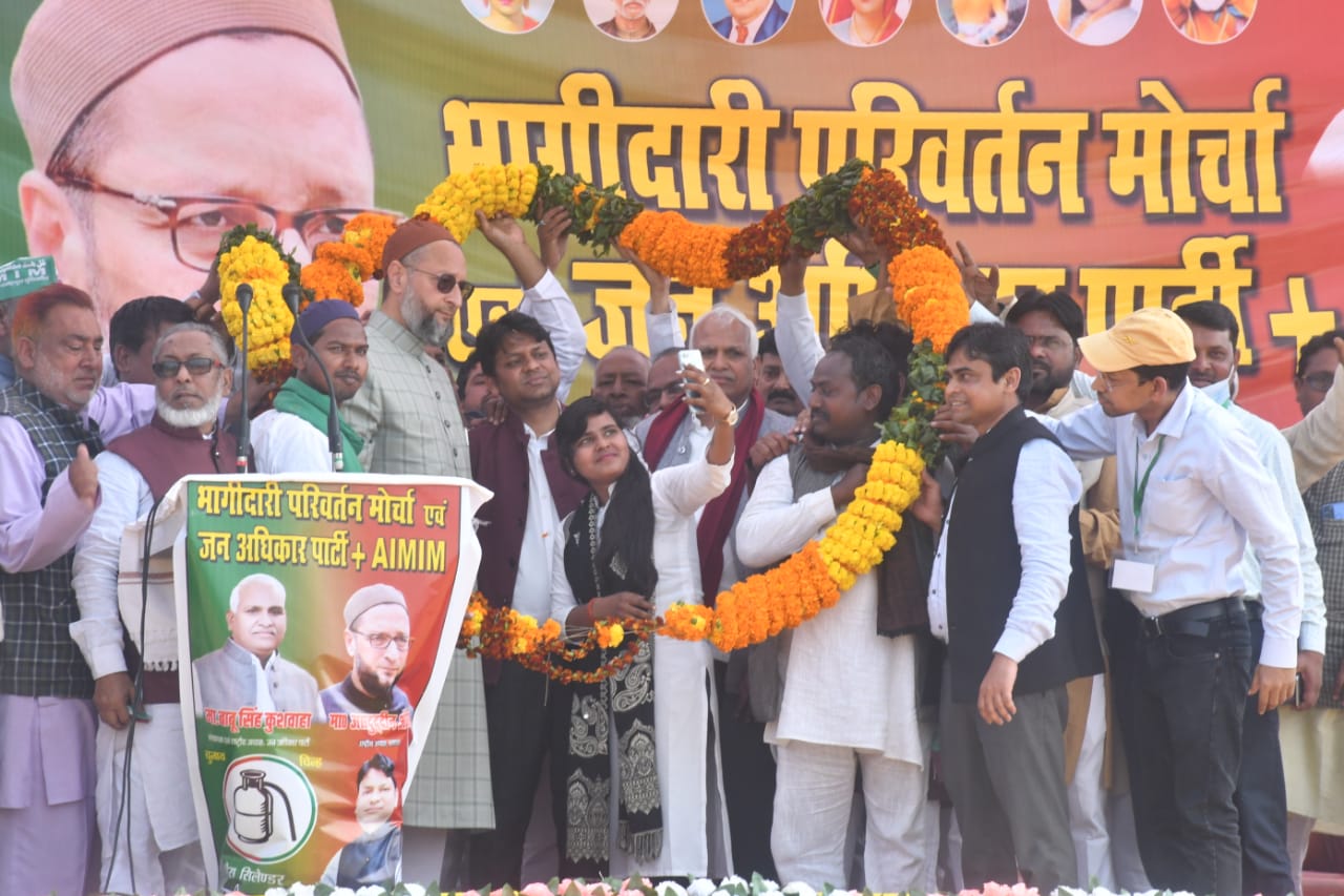 सिद्धार्थननगर: शुक्रवार को नगर पंचायत शोहरतगढ़ के रेलवे स्टेशन के सामने वीरेंद्र सिंह ग्रामीण स्टेडियम में आयोजित भागीदारी परिवर्तन मोर्चा की ओर से कार्यक्रम में पहुंचे ऑल इंडिया इत्तेहादुल मुस्लिमीन ( एआईएमआईएम) पार्टी के राष्ट्रीय अध्यक्ष असदुद्दीन ओवैसी ने चुनावी जनसभा को संबोधित किया। उन्होंने विधानसभा क्षेत्र शोहरतगढ़ 302 के उम्मीदवार डॉक्टर मोहम्मद सरफराज अंसारी और इटवा विधानसभा क्षेत्र के रमेश गौतम के पक्ष में मतदाताओं से मतदान करने की अपील की ।उन्होंने कहा भागीदारी मोर्चा की सरकार बनने पर गरीबों बेरोजगारों बेसहारों और सभी जाति वर्ग के लोगों को सम्मान मिलेगा।