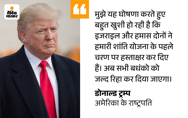 अमेरिकी राष्ट्रपति ट्रम्प की मध्यस्थता से यह युद्धविराम हुआ, जिसके तहत हमास 72 घंटे के भीतर जीवित इजराइली बंधकों को छोड़ेगा। इसके बदले इजराइल 250 फिलिस्तीनी कैदियों और 1700 हिरासत में लिए गए लोगों को रिहा करेगा।