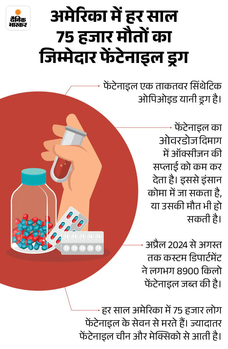 ट्रम्प ने कहा कि चीन फेंटेनाइल जैसे खतरनाक ड्रग्स बनाने वाले केमिकल का सबसे बड़ा सोर्स है। इसके साथ ही वो मेथामफेटामाइन जैसे अन्य नशीले पदार्थों को भी बढ़ावा दे रहा है। ट्रम्प ने चीन से इन रसायनों को रोकने और तस्करों पर कार्रवाई करने को कहा।