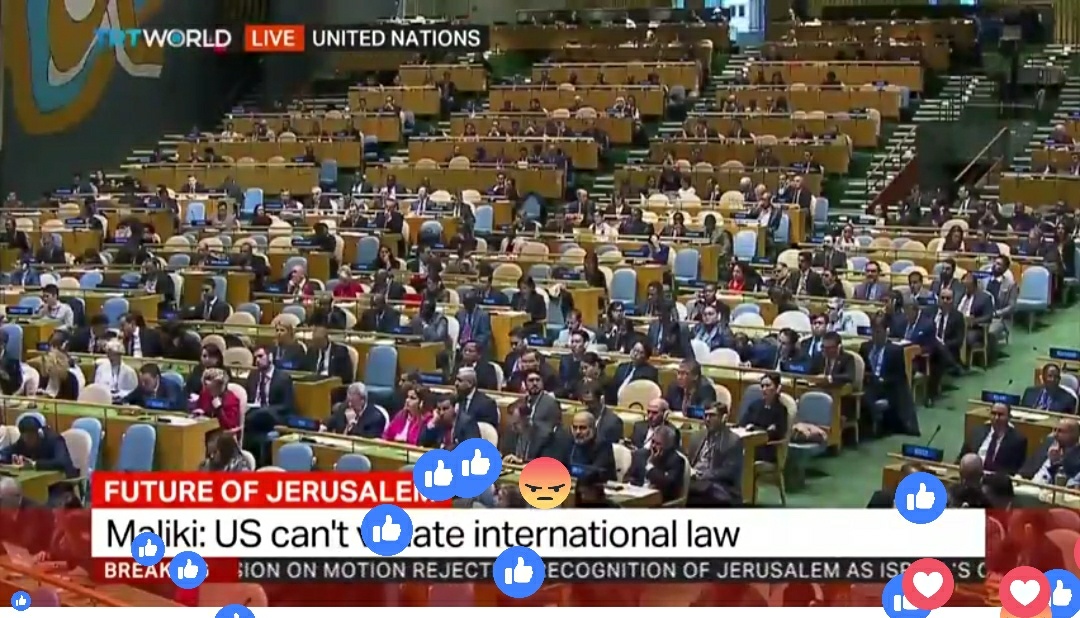 United Nations की हंगामी जनरल असेम्बली में हुई वोटिंग में दुनिया के 128 मुल्कों ने अमेरिकी फैसले (जेरूसलम को इसराईल की राजधानी मानना) के खिलाफ वोटिंग की जबकि 9 मुल्कों ने इसके हक़ में वोट दी।