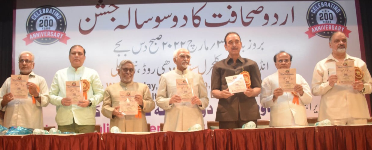 تقریب کے مہمان ذی وقار کانگریس کے سینئررہنما اور راجیہ سبھا میں سابق اپوزیشن غلام نبی آزاد نے کہا کہ مولوی محمد باقر پہلے ایسے صحافی تھے جنہیں توپ کے دہانے پر باندھ کر اڑا دیا گیا۔انہوں نے کہا کہ اردو صحافت کی ایک وسیع تاریخ ہے جس پر مزید تحقیق کی ضرور ت ہے۔انہوں نے کہا کہ گرچہ اردو کا پہلا اخبار جام جہاں نما کو قرار دیا جاتا ہے جس کی اشاعت 1823ء میں کولکاتہ میں ہری ہر دت نے کی تھی لیکن اس کی تاریخ اس سے بھی قبل کی ہے۔1794 میں ٹیپو سلطان نے’فوجی اخبار‘ نکالا تھا جس کیلئے انہوں نے اس وقت پرنٹنگ پریس کو بھی لگوایا۔اسی طرح 1910ء میں ’اسلامک فٹرنیٹی‘ کے نام سے بھی اخبار نکلا جواس وقت جاپان،برما،سنگاپور اور دیگر ممالک میں پڑھاجاتا تھا۔انہوں نے کہا کہ اردو اگر ایک زبان کے طور پر سکڑ رہی ہے تو اس میں ہماری کوتاہیاں بھی شامل ہیں۔جنوبی ہندوستان میں لوگ آج بھی مقامی زبان کے اخبار پڑھتیاور ٹیلی ویڑن دیکھتے ہیں۔محض چند فیصد ایسے افراد ہوں گے جو انگریزی یا دیگر زبان میں اخبار پڑھتے ہوں گے یا چینل دیکھتے ہوں گے۔انہوں نے تقریباً 27سال قبل شہری ہوابازی کے مرکزی وزیر کے طور پر اردو اخبارات کیلئے 10فیصد اشتہارکا کوٹہ مقرر کرنے کا بھی ذکر کیا۔ مہمان خصوصی اور سابق نائب صدر جمہوریہ ہند محمد حامد انصاری نے کہا کہ اردو صرف ہندوستان یا بر صغیر کی زبان نہیں بلکہ ایک بین الاقوامی زبان ہے۔انہوں نے کہا کہ ہر 10سالہ مردم شماری سے یہ بات واضح ہوجاتی ہے کہ اردو بولنے والوں کی تعداد کم ہورہی ہے۔