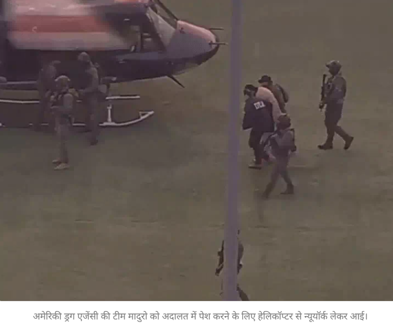 इससे पहले मादुरो को लेकर एक हेलिकॉप्टर अदालत के पास बने हेलिपैड पर उतरा था। हेलिकॉप्टर के उतरते ही उन्हें तुरंत एक वैन में बैठाया गया और वहां से सीधे अदालत ले जाया गया। मादुरो को शुक्रवार को उतनी पत्नी सिलिया फ्लोरेस के साथ वेनेजुएला से पकड़ा गया था।