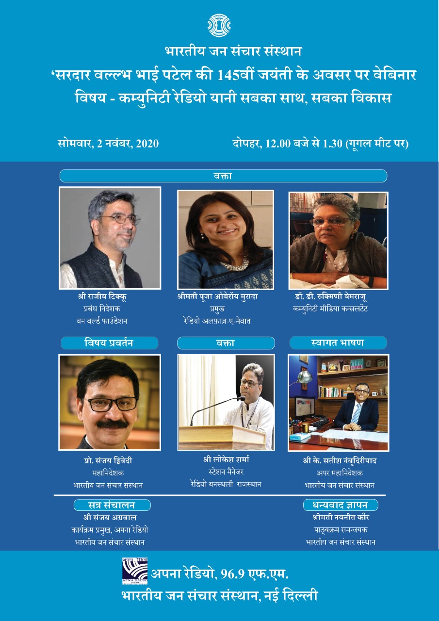 नई दिल्ली, 30 अक्टूबर । सरदार वल्लभभाई पटेल की 145वीं जयंती के अवसर पर 2 नवंबर को भारतीय जन संचार संस्थान (आईआईएमसी) में ‘कम्युनिटी रेडियो यानी सबका साथ, सबका विकास’ विषय पर वेबिनार का आयोजन किया जाएगा। इस कार्यक्रम में देश के प्रमुख विद्धान अपने विचार व्यक्त करेंगे।