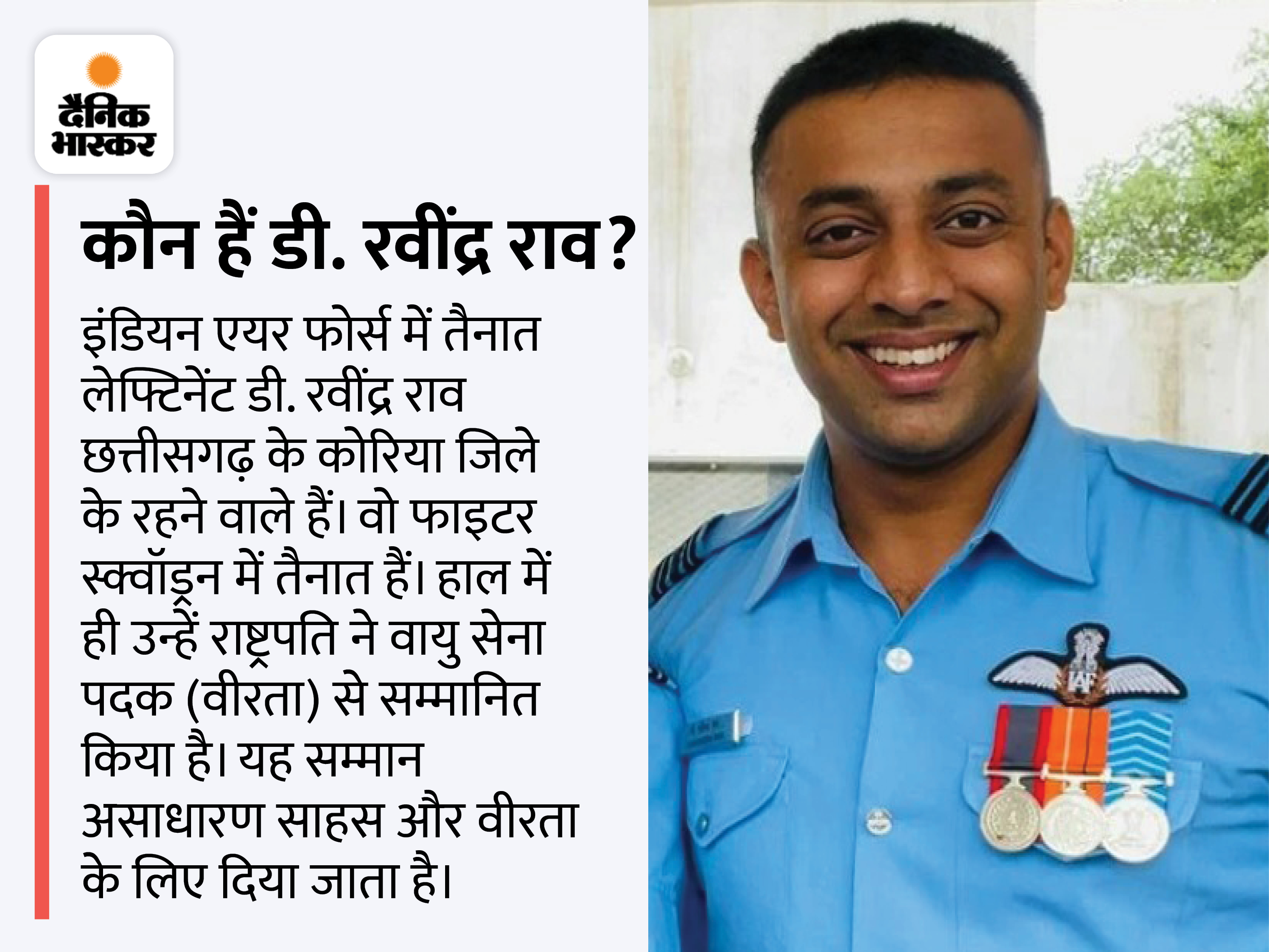 इंडियन एयरफोर्स ने फ्लाइट लेफ्टिनेंट डी. रवींद्र राव को बीते 15 अगस्त को वीरता पदक से सम्मानित किया है। 6 नवंबर 2021 को आगरा (UP) स्थित एयर फोर्स स्टेशन के अंदर लैंड करते समय जगुआर फाइटर प्लेन क्रैश हुआ था। पायलट बुरी तरह फंसा हुआ था। उसकी जान बचाने का श्रेय राव को देते हुए पदक दिया गया है।