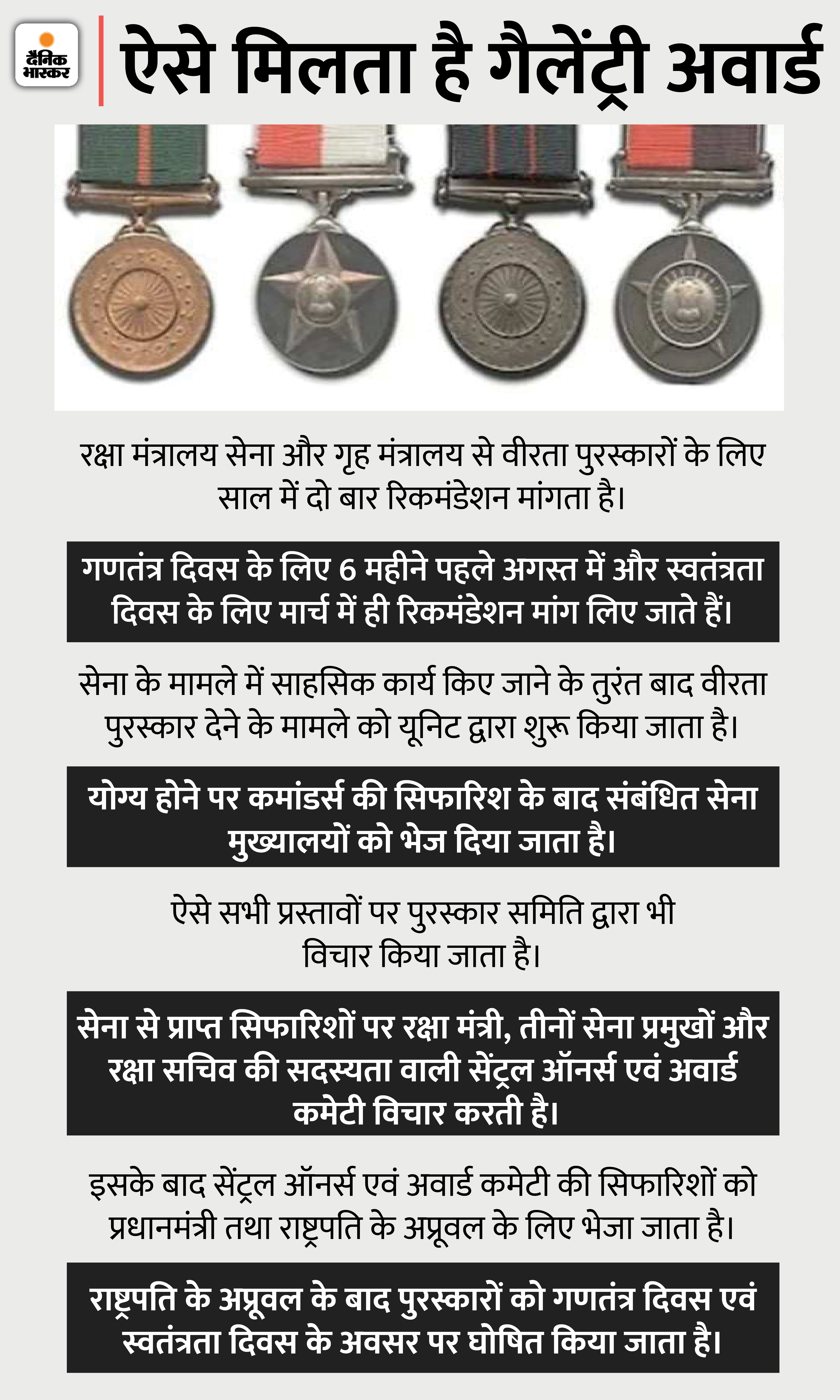 सैनिकों को दिए जाने वाले अवॉर्ड को दो भागों में बांटा गया है। इनमें एक गैलेंट्री अवॉर्ड और दूसरा नॉन गैलेंट्री अवॉर्ड होता है। गैलेंट्री अवॉर्ड को भी दो अलग-अलग कैटेगरी में दिया जाता है। जंग में वीरता के साथ दुश्मन का सामना करने वाले सैनिकों को भी गैलेंट्री अवॉर्ड से नवाजा जाता है। इसके अलावा जो सैनिक आपदा और अन्य जरूरी हालातों में अद्भुत साहस और वीरता का परिचय देते हैं। उन्हें भी गैलेंट्री अवॉर्ड से सम्मानित किया जाता है।