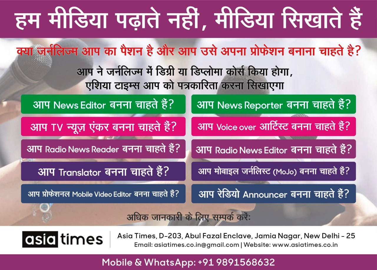 नई दिल्ली : अगर जर्नलिज्म आप का पैशन है और आप उसे अपना प्रोफेशन बनाना चाहते है आप ने जर्नलिज्म में डिग्री या डिप्लोमा कोर्स किया होगा , एशिया टाइम्स आप को पत्रकारिता करना सिखाएगा , हम मीडिया पढ़ाते नहीं मीडिया सिखाते हैं .