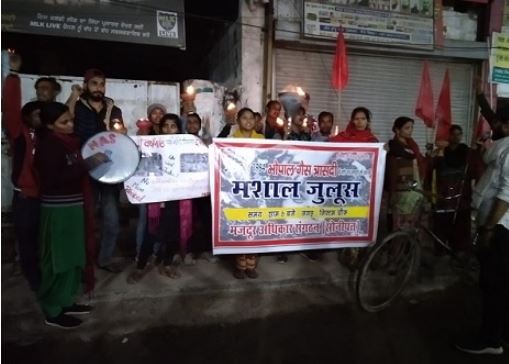 पीड़ितों के सभी परिवारों को मुआवजा देने में विफलता के लिए मध्य प्रदेश सरकार की निंदा करते हुए कार्यकर्ताओं ने "मशाल मार्च" का आयोजन किया