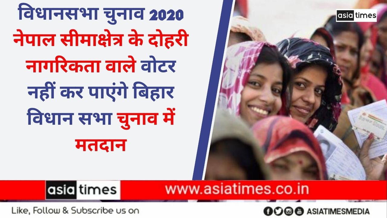 बिहार विधानसभा चुनाव में इस बार नेपाल सीमा से लगे विधानसभा क्षेत्रों में दोहरी नागरिकता रखने वाले वोटर मतदान नहीं कर पाएंगे। इसका कारण दोनों देश के बीच बढ़ी तल्खी और सीमा पर बरती जा रही अतिरिक्त सतर्कता है।