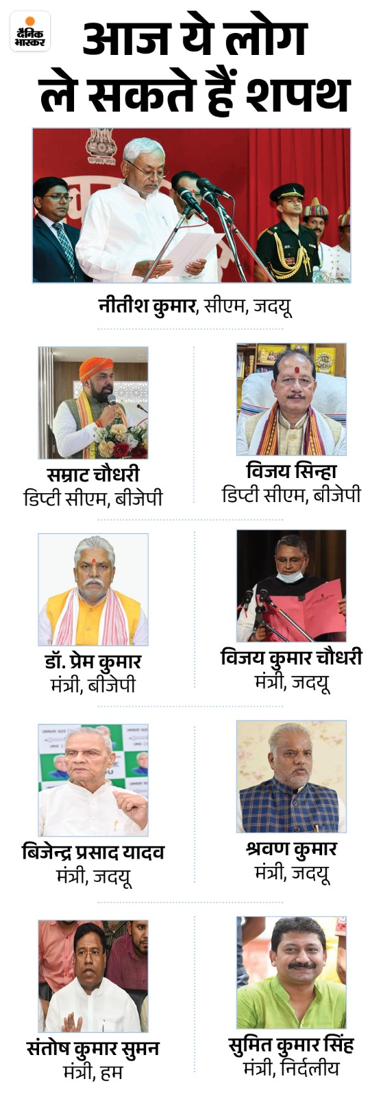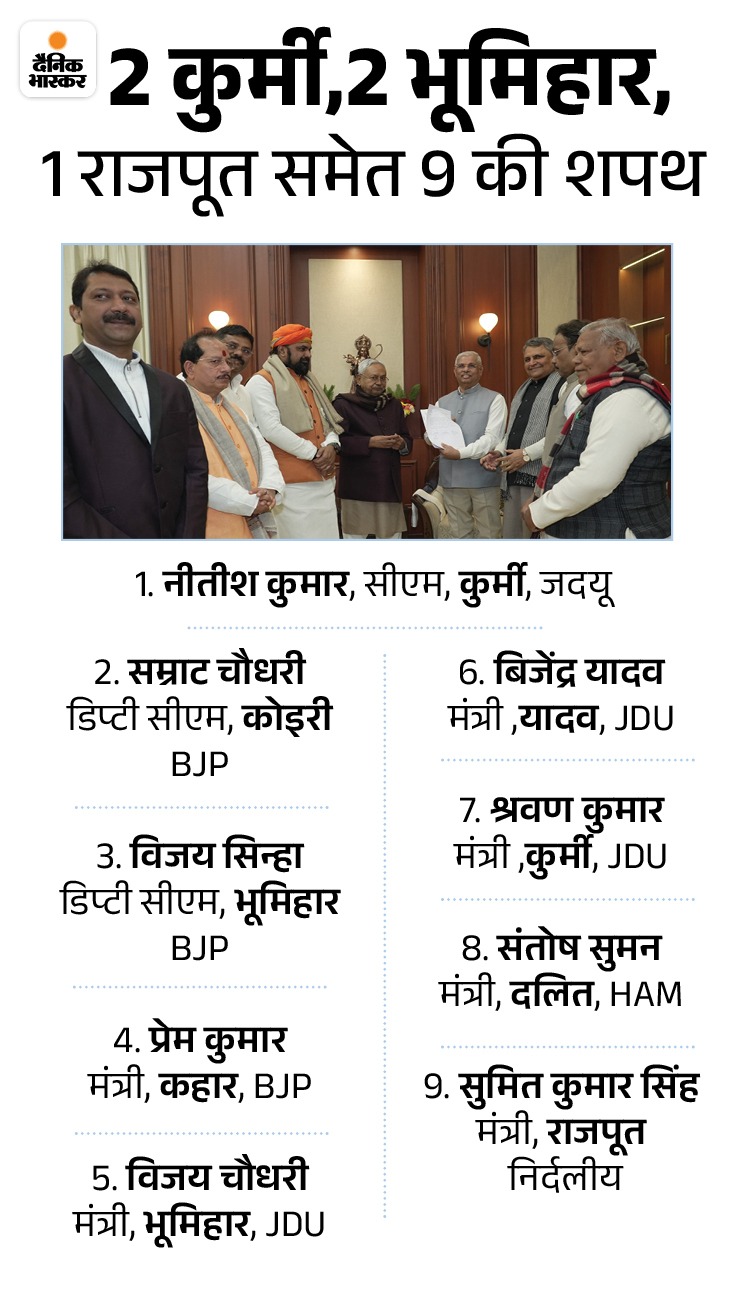 शाम पांच बजे हुए समारोह में नीतीश के साथ कुल 8 मंत्रियों ने शपथ ली। मंत्रियों में मुख्यमंत्री समेत 2 कुर्मी, 2 भूमिहार, 1-1 राजपूत, दलित, कहार, कोइरी और यादव हैं। सभी का संक्षिप्त ब्योरा नीचे दिया गया है...