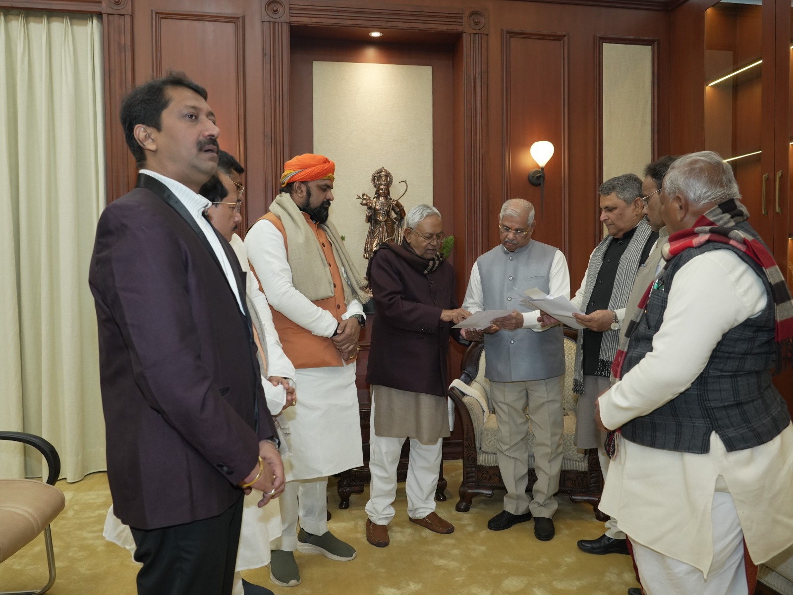 नीतीश कुमार ने जेडीयू के 45, भाजपा के 78 और हिंदुस्तान अवामा मोर्चा (हम) के 4 और एक निर्दलीय विधायक के समर्थन की चिट्ठी राज्यपाल राजेंद्र विश्वनाथ आर्लेकर को सौंप दी है।