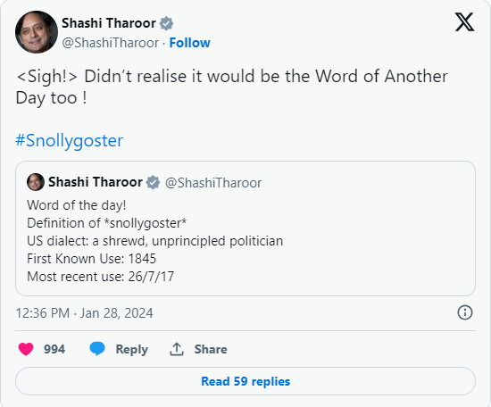 नीतीश के INDIA छोड़कर NDA में शामिल होने को लेकर कांग्रेस नेता शशि थरूर ने भी निशाना साधा। उन्होंने 2017 के अपने ही ट्वीट को रीट्वीट किया, जिसमें उन्होंने अंग्रेजी के शब्द स्नोलीगॉस्टर का मतबल समझाया था। उस ट्वीट के मुताबिक, स्नोलीगॉस्टर शब्द ऐसे नेताओं के लिए इस्तेमाल होता है, जो लोगों की सेवा करने की बजाय अपने निजी फायदों की चिंता ज्यादा करता है। थरूर ने कहा था कि यह वर्ड ऑफ द डे है।