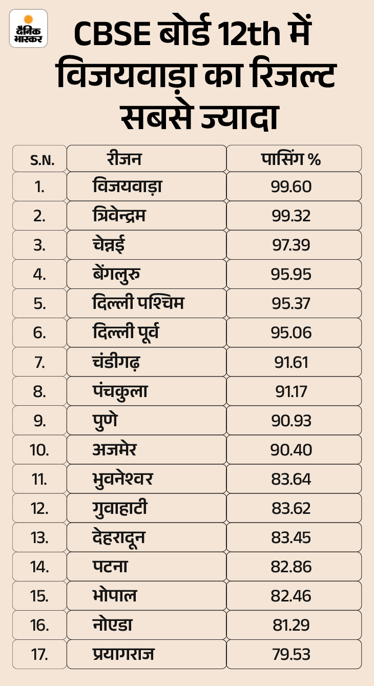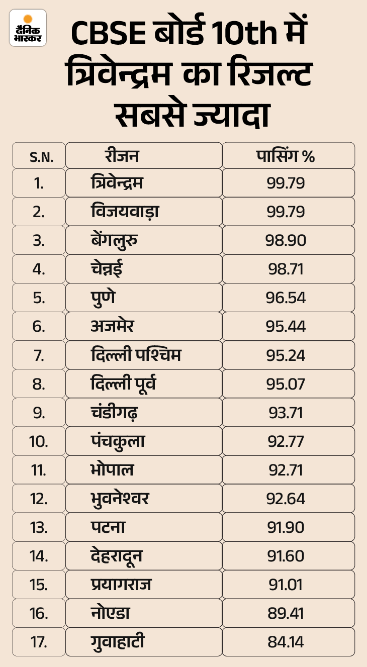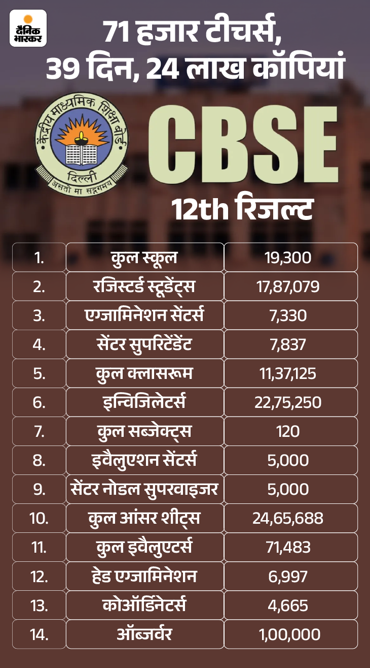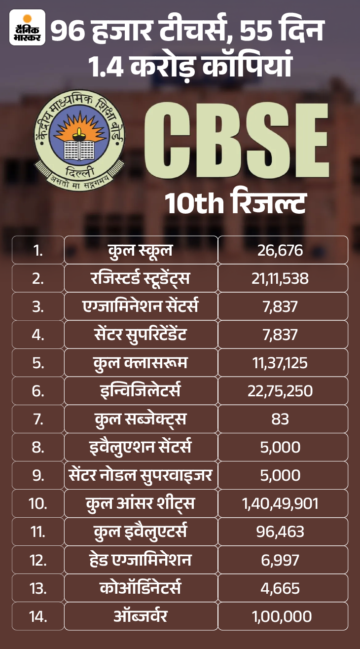 CBSE यानी सेंट्रल बोर्ड ऑफ सेकेंडरी एजुकेशन ने मंगलवार को 10वीं और 12वीं का रिजल्ट जारी कर दिया है। 10वीं में 93.60% और 12वीं में 88.39% स्टूडेंट्स पास हुए। कैंडिडेट्स cbse.gov.in पर अपना रिजल्ट चेक कर सकते हैं। इस साल 10वीं और 12वीं के करीब 44 लाख स्टूडेंट्स ने बोर्ड एग्जाम्स दिए थे।