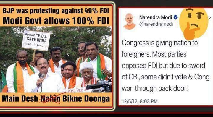 कांग्रेस ने सब से पहले FDI लाया और परकीय राष्ट्र को 26% निवेश की इजाज़त दी। यह एक किसम का देश बेचने का प्रयास था।BJP ने FDI का कड़ा विरोध किया। रास्ते पर आगये।