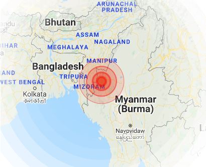 एजेंसी के अनुसार, भूकंप का केंद्र Champhai, Mizoram, India से 58 किलोमीटर दक्षिणपूर्व (SE) में था. भूकंप भारतीय समयानुसार 3:42 PM बजे सतह से 60 किलोमीटर की गहराई में आया.