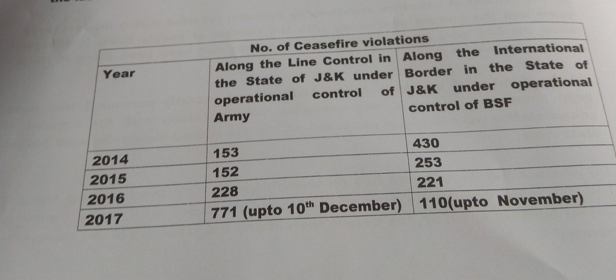 गृह मंत्रालय ने यह भी बताया कि जम्मू-कश्मीर में नियंत्रण रेखा पर युद्ध विराम के उल्लंघन में तेजी से बढ़ोत्तरी हुई है। 2014 में सीजफायर उल्लंघन की संख्या सिर्फ 153 थी, लेकिन यह 10 दिसंबर 2017 तक पहुंच कर 771 हो गई। यह 2016 से 300% से अधिक वृद्धि थी।