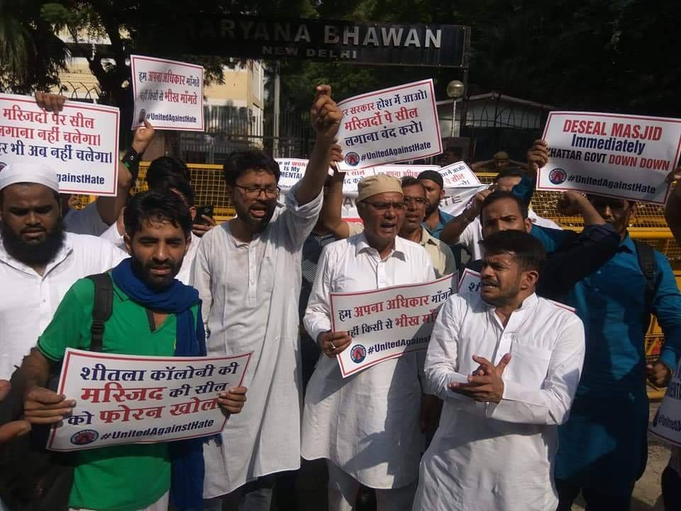 गुरुग्राम में सील की गयी मस्जिद के विरोध में हरियाणा भवन दिल्ली के सामने जोरदार प्रदर्शन