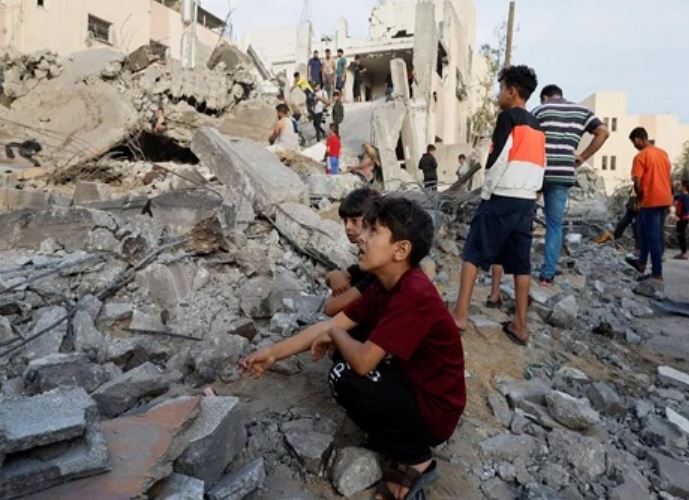 मलबे के बीच बैठे फिलिस्तीनी बच्चे और दक्षिणी गाजा पट्टी में खान यूनिस में इजरायली छापे में नष्ट हुई इमारत का निरीक्षण करते लोग [मोहम्मद सलेम/रॉयटर्स]