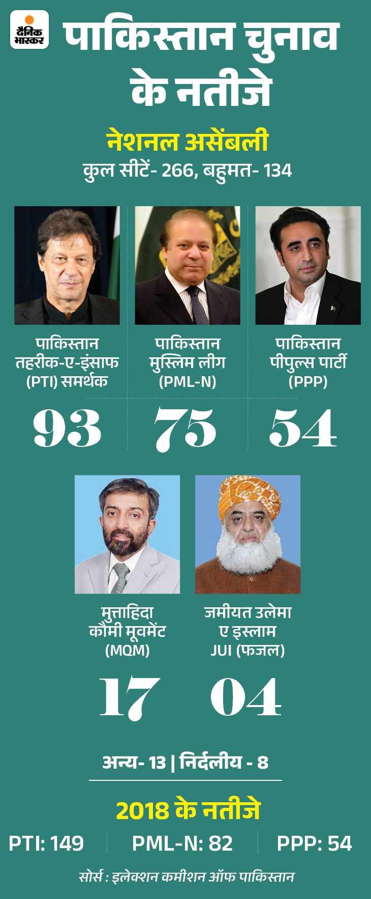 दूसरी तरफ, इमरान खान की पार्टी PTI के समर्थन से जीते निर्दलीय पाला बदलकर नवाज के साथ जाने लगे हैं। पाकिस्तान की नेशनल असेंबली में कुल 336 सीटें हैं। इनमें से 265 सीटों पर चुनाव हुए। एक सीट पर चुनाव टाल दिया गया, जबकि एक सीट NA-88 के नतीजों को खारिज कर दिया गया है। यहां 15 फरवरी को फिर से वोटिंग होगी। बाकी 70 सीटें रिजर्व हैं।