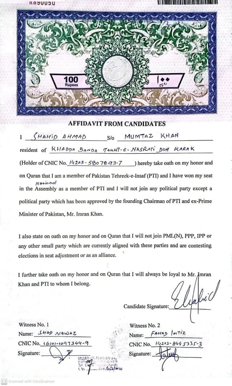 इमरान खान की पार्टी ने निर्दलीयों को PTI से जोड़े रखने के लिए स्ट्रैटेजी बनाई है। पार्टी जीते हुए सभी उम्मीदवारों से शपथ पत्र भरवा रही है। इसमें लिखा है कि वो खान की मर्जी के बिना किसी पार्टी में नहीं जाएंगे। नेशनल असेंबली 38 की सीट से जीते इमरान समर्थक एक निर्दलीय उम्मीदवार का शपथ पत्र सामने आया है । इसमें वो वादा कर रहे हैं कि पार्टी के प्रति वफादार रहेंगे।