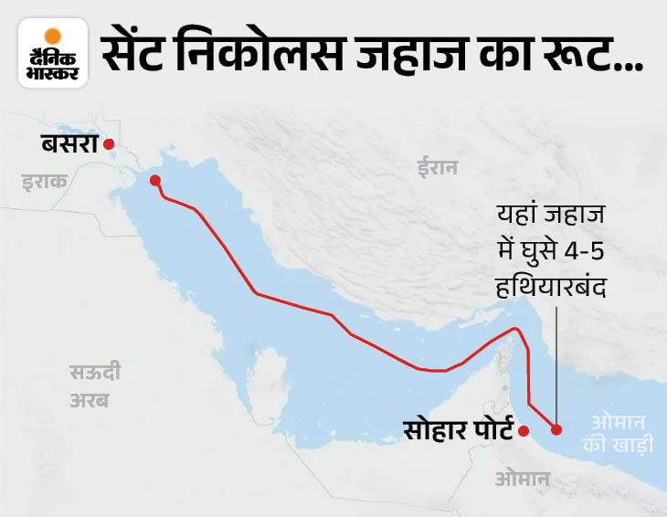 यूनाइटेड किंगडम मैरीटाइम ट्रेड ऑपरेशंस (UKMTO) के मुताबिक, गुरुवार सुबह ओमान के सोहार पोर्ट के पास कुछ हथियारबंद लोगों ने सेंट निकोलस जहाज को अपने कब्जे में ले लिया था। इन लोगों ने जहाज को ईरान की तरफ ले जाने के आदेश दिए थे।