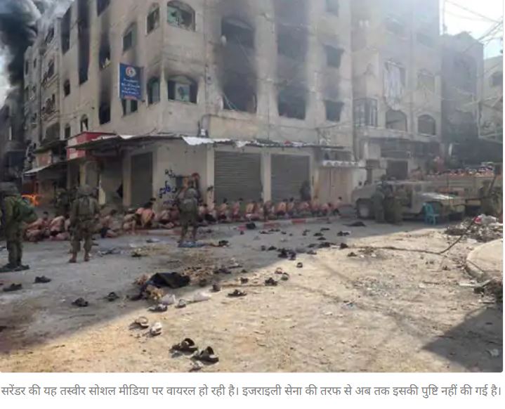 इजराइली सेना ने गाजा में कई फिलिस्तीनियों को बंधक बनाया है। इजराइल इन्हें हमास आतंकी कह रहा है। दावा किया जा रहा है कि इन्होंने सरेंडर किया है। इनके शरीर पर कपड़े नहीं है। लोग सिर्फ अंडर गारमेंट्स में नजर आ रहे हैं। इनकी आंखों पर पट्टी बंधी हुई है और हाथ पीछे की तरफ बंधे हैं।