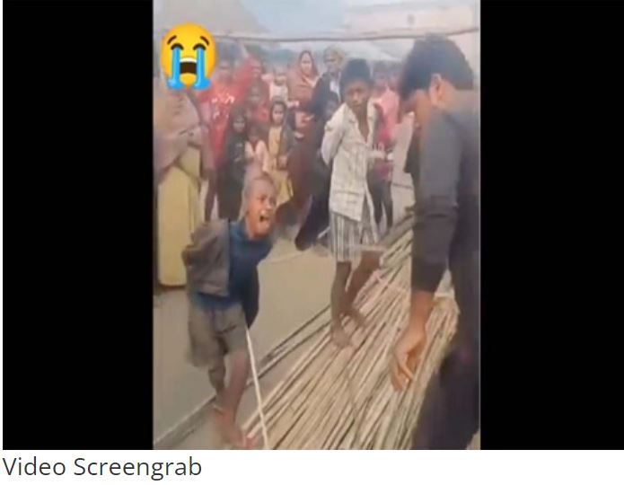 घटना के वीडियो में दिखाया गया है कि लोगों का एक समूह चुपचाप खड़ा है और आदमी रोते हुए बच्चों को बेरहमी से पीटता रहता है