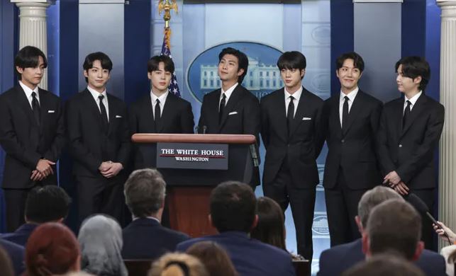 K-pop म्यूज़िक के लिए मशहूर सभी सात सदस्यों ने व्हाइट हाउस के ब्रीफिंग रूस के पोडियम पर पत्रकारों से बात की. एक जैसे काले सूट और सफेद शर्ट और टाई में लड़कों का यह बैंड व्हाइट हाउस में एक गंभीर संदेश देने आया था.