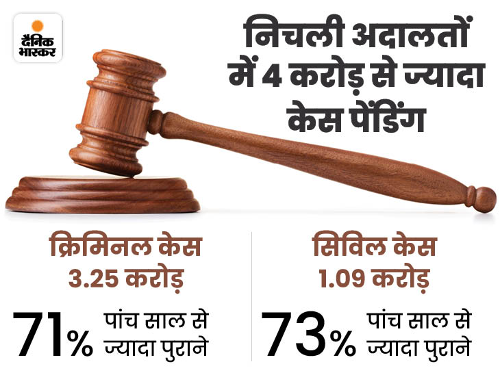6 महीने में सुप्रीम कोर्ट के पेंडिंग केस 10 हजार बढ़े मेघवाल ने बताया कि मौजूदा समय में 80 हजार केस सुप्रीम कोर्ट में लंबित हैं। छह महीने पहले 1 जुलाई को सुप्रीम कोर्ट में पेंडिंग केसों की संख्या 69 हजार 766 थी। जो 1 दिसंबर को बढ़कर 80 हजार से ज्यादा हो गई। तीन साल पहले 10 हजार पेंडिंग केस बढ़ने में मार्च 2020 से जुलाई 2023 तक का समय लगा था।