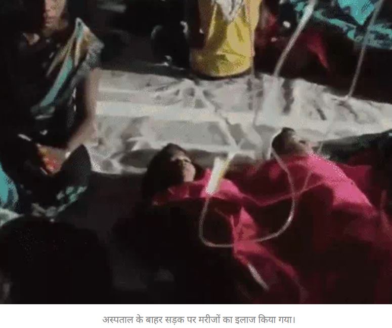 मामले का वीडियो भी सामने आया है। इसमें दिख रहा है कि एक अस्पताल के बाहर सड़क पर कई मरीजों का इलाज किया जा रहा है। सलाइन की बोतलें पेड़ों से बंधी रस्सियों से लटकाई गई हैं।