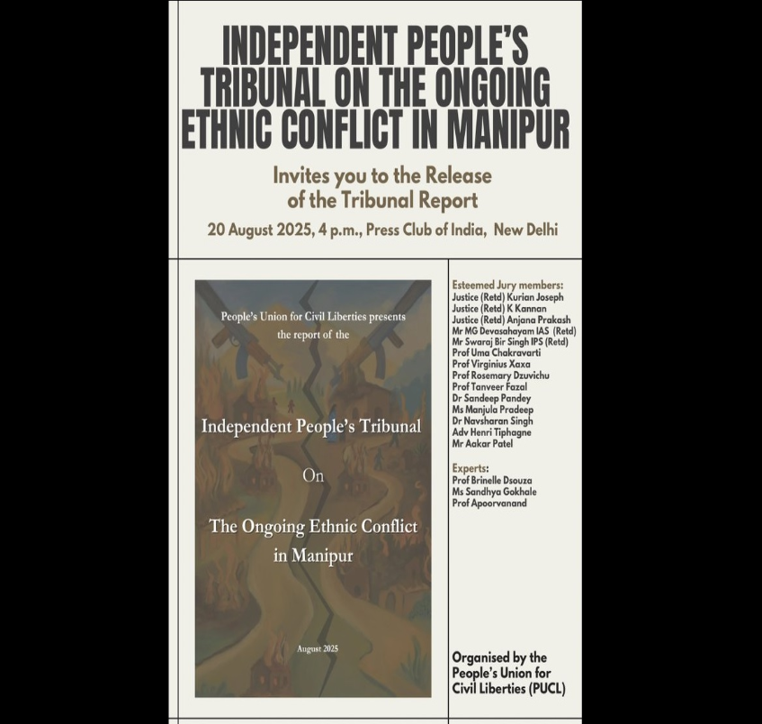 पीपल्स यूनियन फॉर सिविल लिबर्टीज़ (PUCL) द्वारा आयोजित इंडिपेंडेंट पीपल्स ट्राइब्यूनल (IPT) ने 3 मई 2023 को मणिपुर में हिंसा भड़कने के बाद वहां की संवैधानिक शासन व्यवस्था के पतन का निष्पक्ष विवरण प्रस्तुत किया है। दो वर्षों से अधिक की अवधि में ट्राइब्यूनल ने जनसंहार, लक्षित हत्याओं, घरों और चर्चों को नुकसान पहुंचाने की घटनाओं, यौन हिंसा, जातीय सफाया और जबरन अलगाव जैसे गंभीर अपराधों के प्रमाण संकलित किए हैं। लगभग 50,000 से 60,000 लोग अब भी विस्थापित हैं और 350 से अधिक राहत शिविरों में रहने को मजबूर हैं। 2024 के अंत तक लगभग 260 मौतों की पुष्टि हुई थी। ट्राइब्यूनल ने इस त्रासदी के लिए मणिपुर राज्य की प्रणालीगत विफलताओं, उसकी संस्थाओं की पक्षपातपूर्ण भूमिका और सशस्त्र गैर-राज्य कारकों की बेखौफ गतिविधियों को जिम्मेदार ठहराया है।